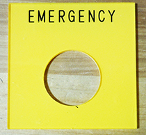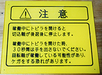 こちらは非常停止部に表示する銘板です。注意を喚起する意味からも黄色地赤文字で作成しております。60x100mmサイズで800円です。その他のサイズも取り扱っております。 非常停止銘板